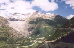 Blick zurück auf den Rhonegletscher, Belveder und die Furkastraße (von links).